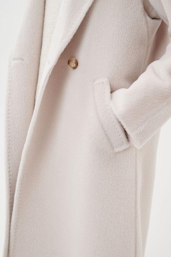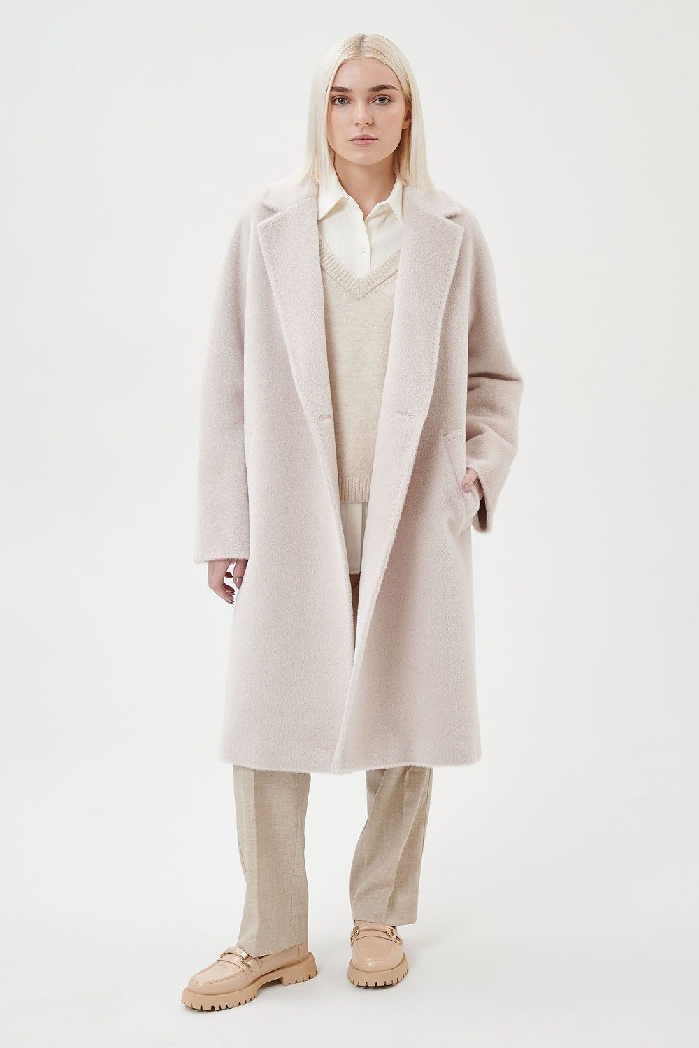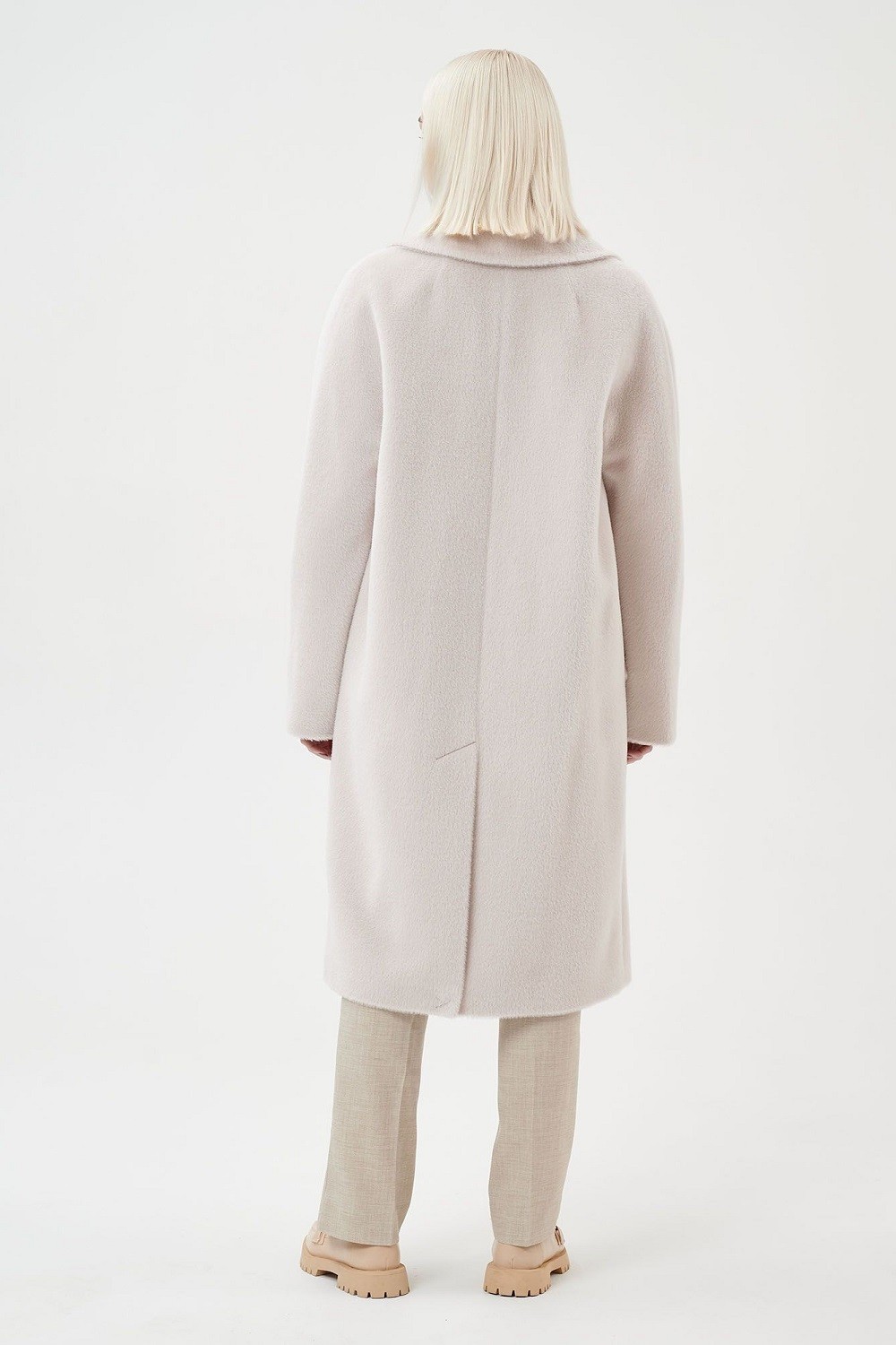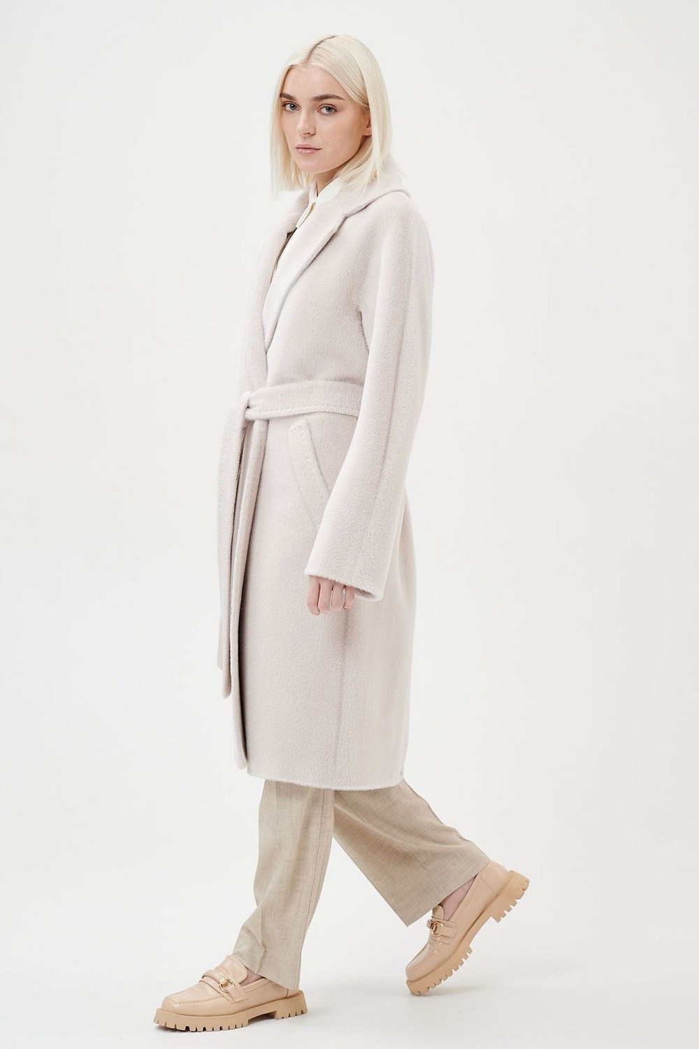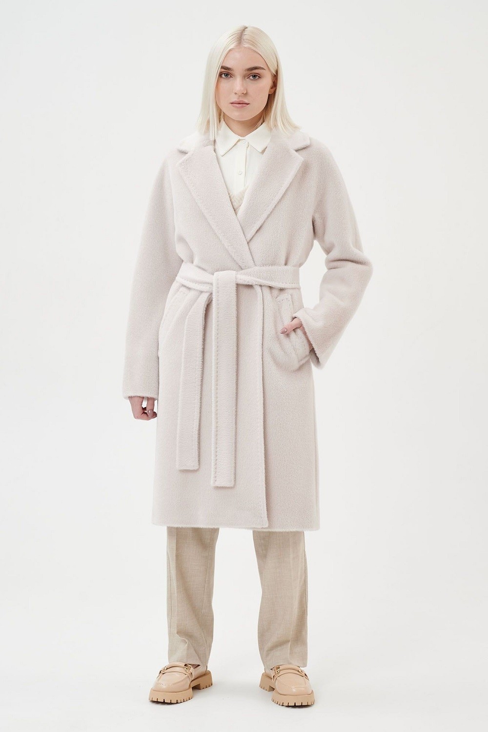 Пальто с английским воротником, двумя прорезными карманами с ласточкой, двубортной застежкой на пуговицы и поясом в тон. Прямой силуэт, цельнокроеный рукав. С подкладкой. Длина пальто 104,5 см. Состав верха: Бэби сури альпака - 35%, Супер сури альпака - 35%, Натуральная шерсть - 30% (В зависимости от цвета состав ткани может варьироваться). Подкладка: Вискоза - 100%, Детали: Тип рукава - цельнокроеный, Силуэт - прямой, Воротник - английский, Тип карманов - прорезной, Застежка - пуговицы.