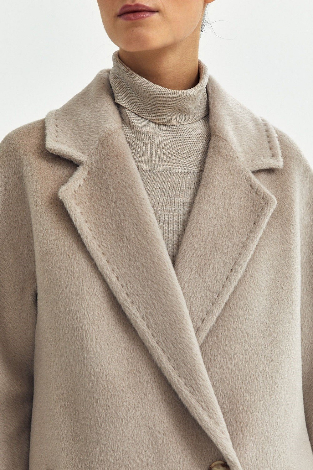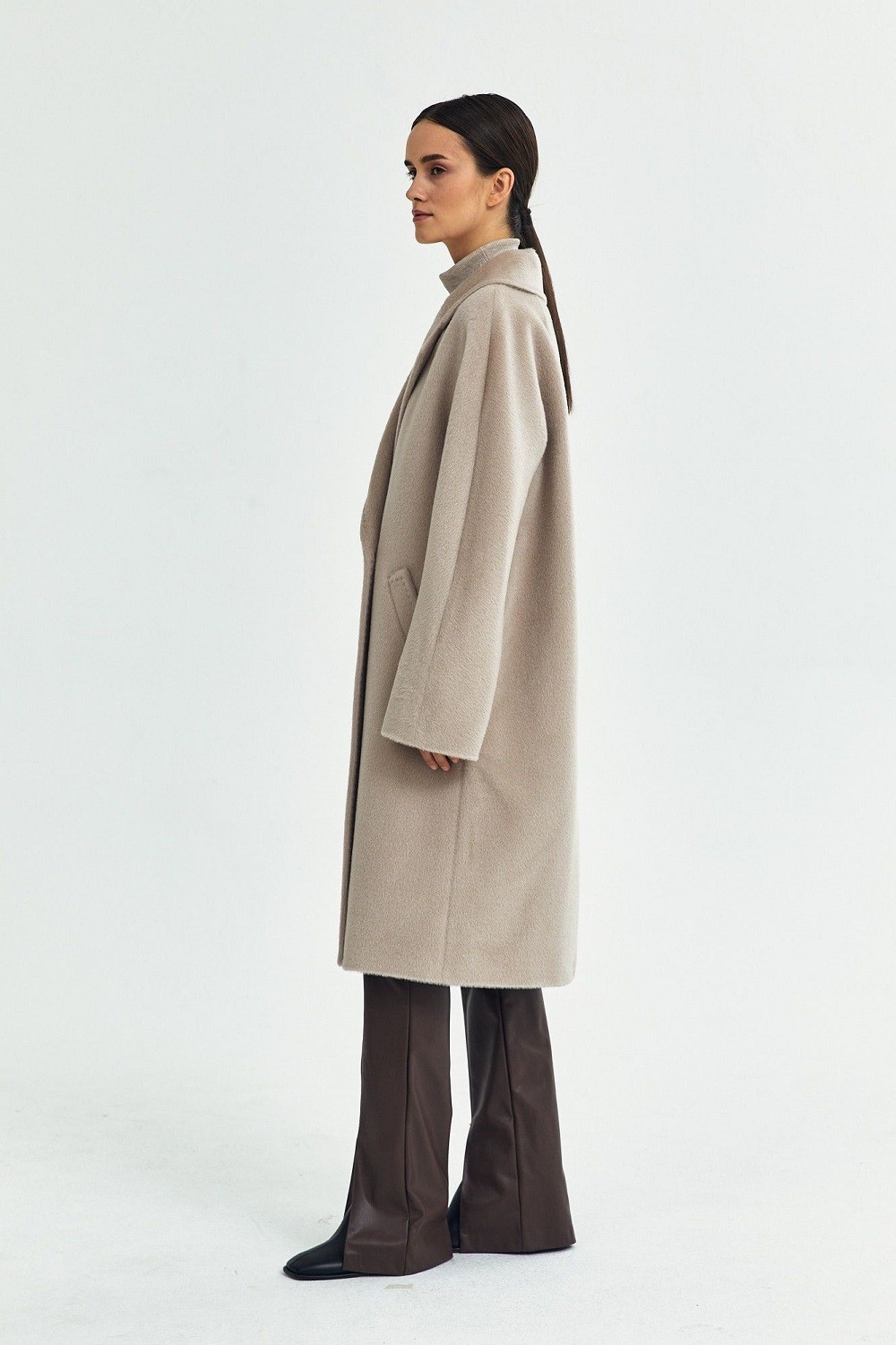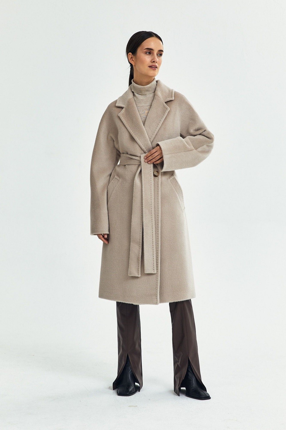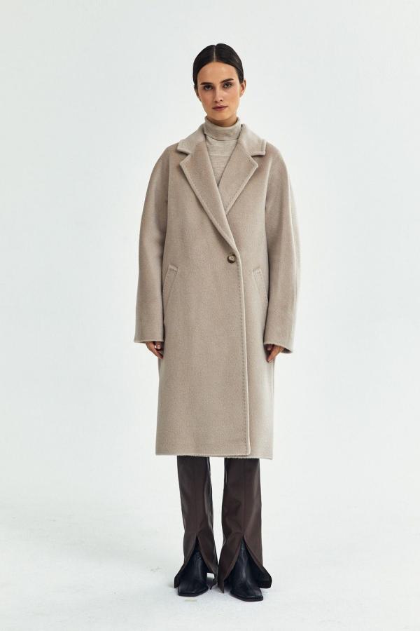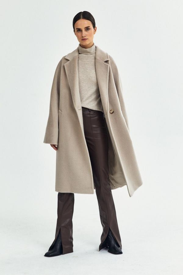 Пальто с английским воротником, двумя прорезными карманами с ласточкой, двубортной застежкой на пуговицы и поясом в тон. Прямой силуэт, цельнокроеный рукав. С подкладкой. Длина пальто 104,5 см. Состав верха: Бэби сури альпака - 35%, Супер сури альпака - 35%, Натуральная шерсть - 30% (В зависимости от цвета состав ткани может варьироваться). Подкладка: Вискоза - 100%, Детали: Тип рукава - цельнокроеный, Силуэт - прямой, Воротник - английский, Тип карманов - прорезной, Застежка - пуговицы.