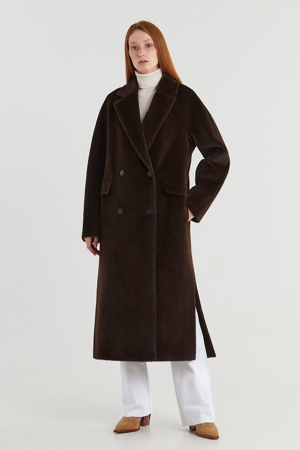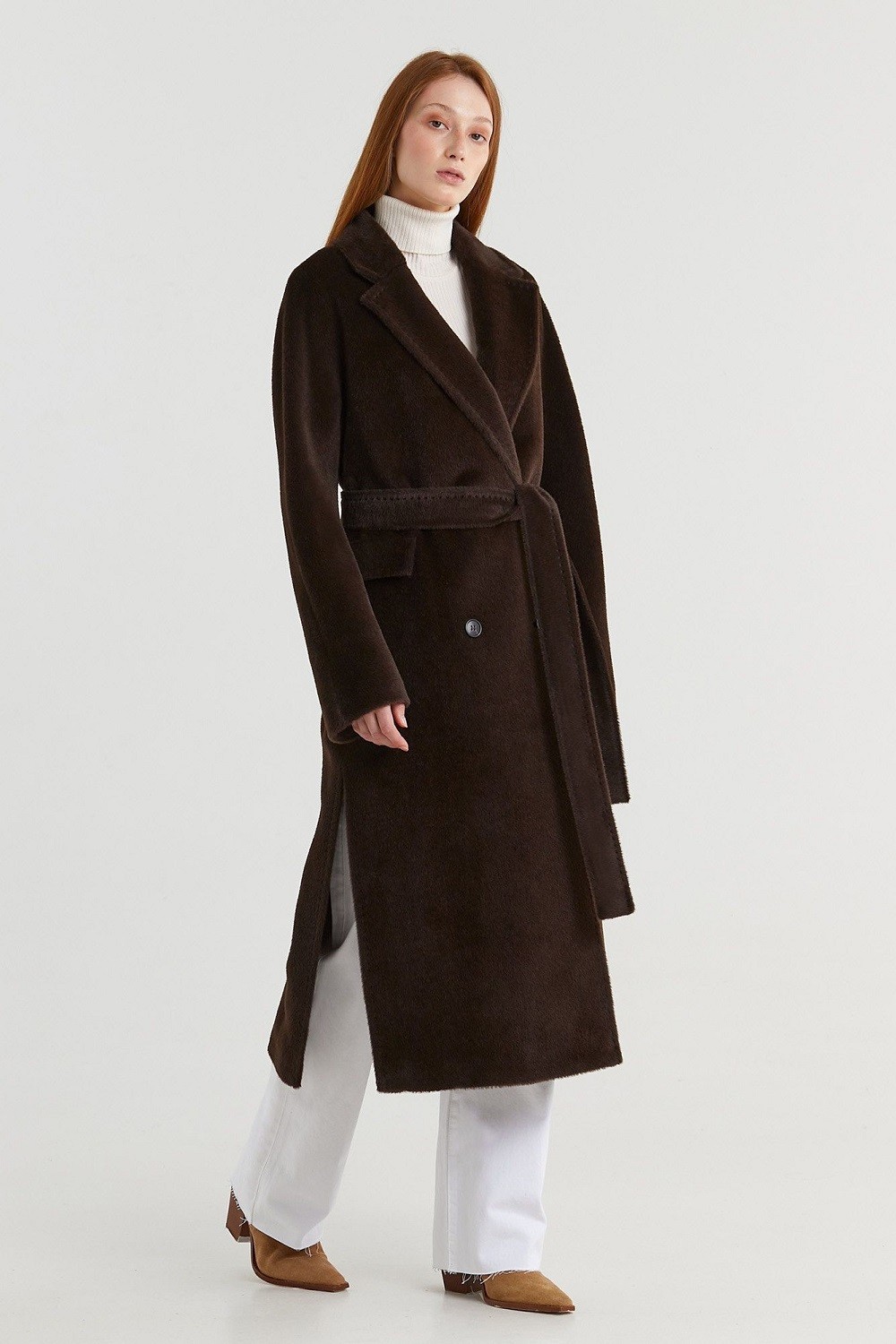 Двубортное пальто прямого силуэта с английским воротником представлено в нескольких благородных оттенках. Цельнокроеный рукав, застежка на роговые пуговицы, карманы в шве с декоративным клапаном — классические элементы данной модели. Высокие разрезы в боковых швах. Пояс в тон. Подкладка из вискозы. Длина пальто 119,5 см. Состав верха: Сури альпака - 75%, Натуральная шерсть - 25%. В зависимости от цвета состав ткани может варьироваться. Подкладка: Вискоза - 100%.