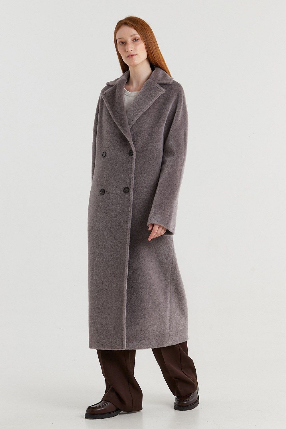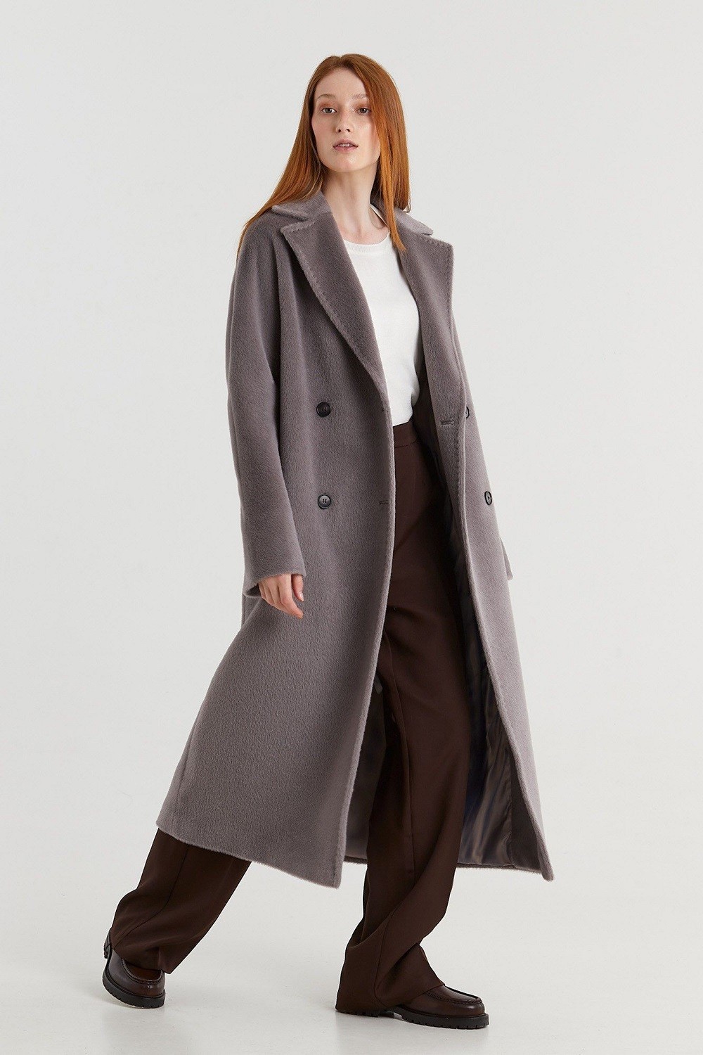 Пальто представлено в двух вариантах состава: шерсть альпака сури и альпака бэби сури. Длина пальто 120 см. Состав верха: Бэби сури альпака - 35%; Супер сури альпака - 35%; Натуральная шерсть - 30%. В зависимости от цвета состав ткани может варьироваться. Подкладка: Вискоза - 100%.