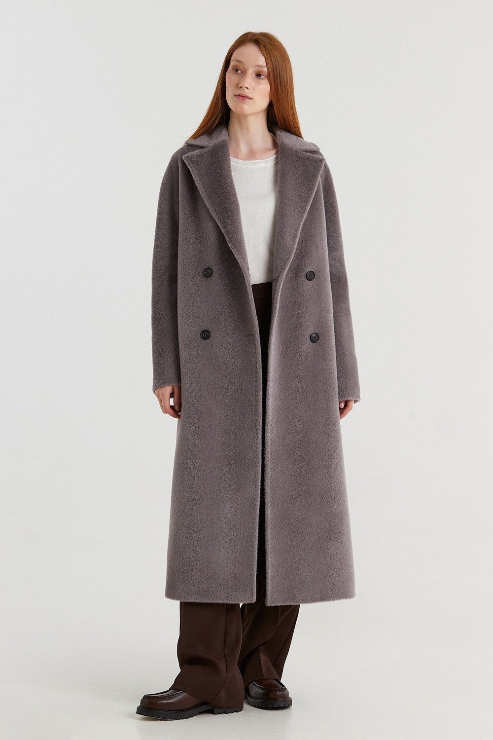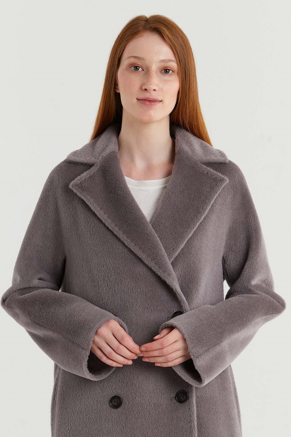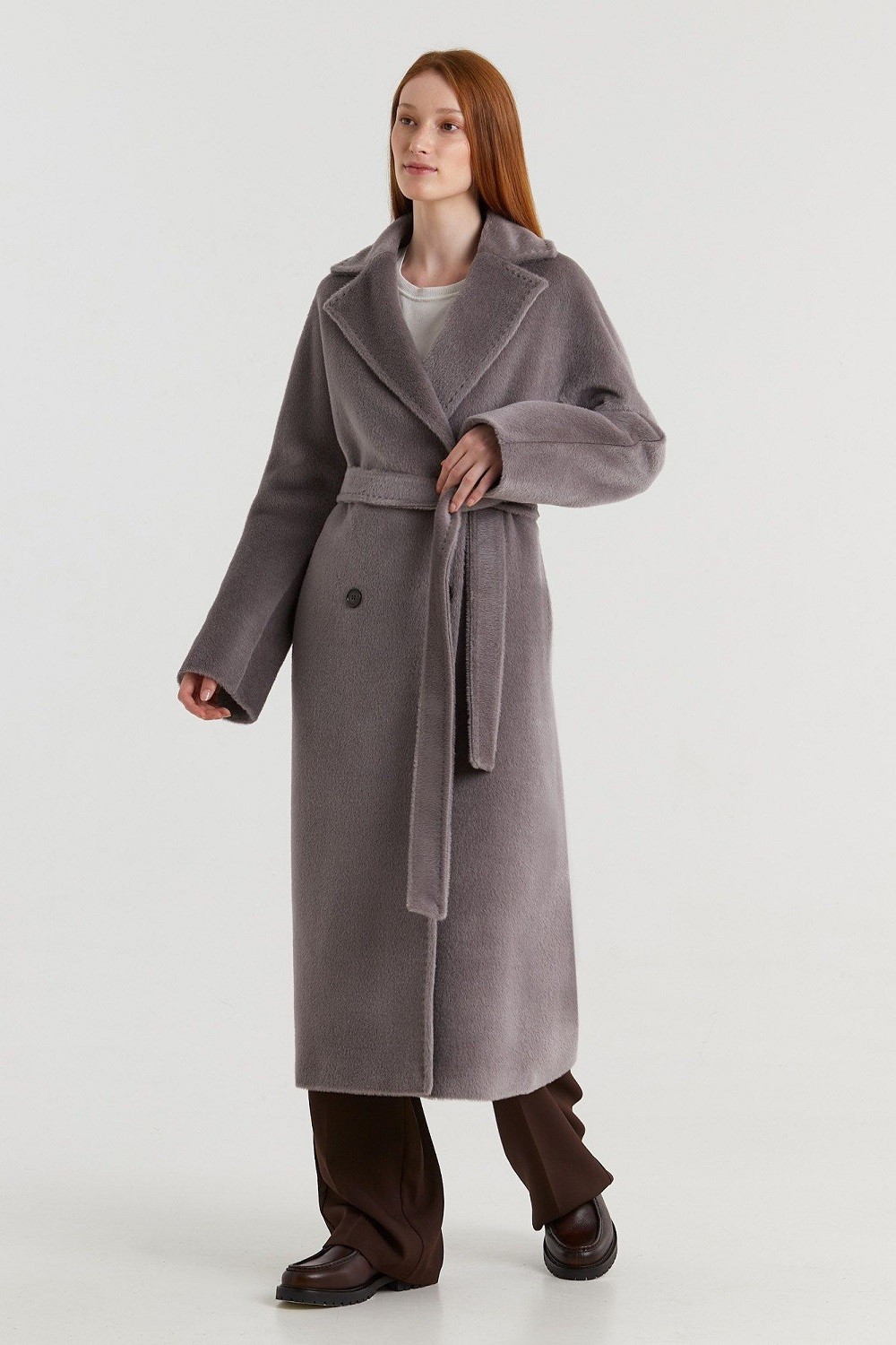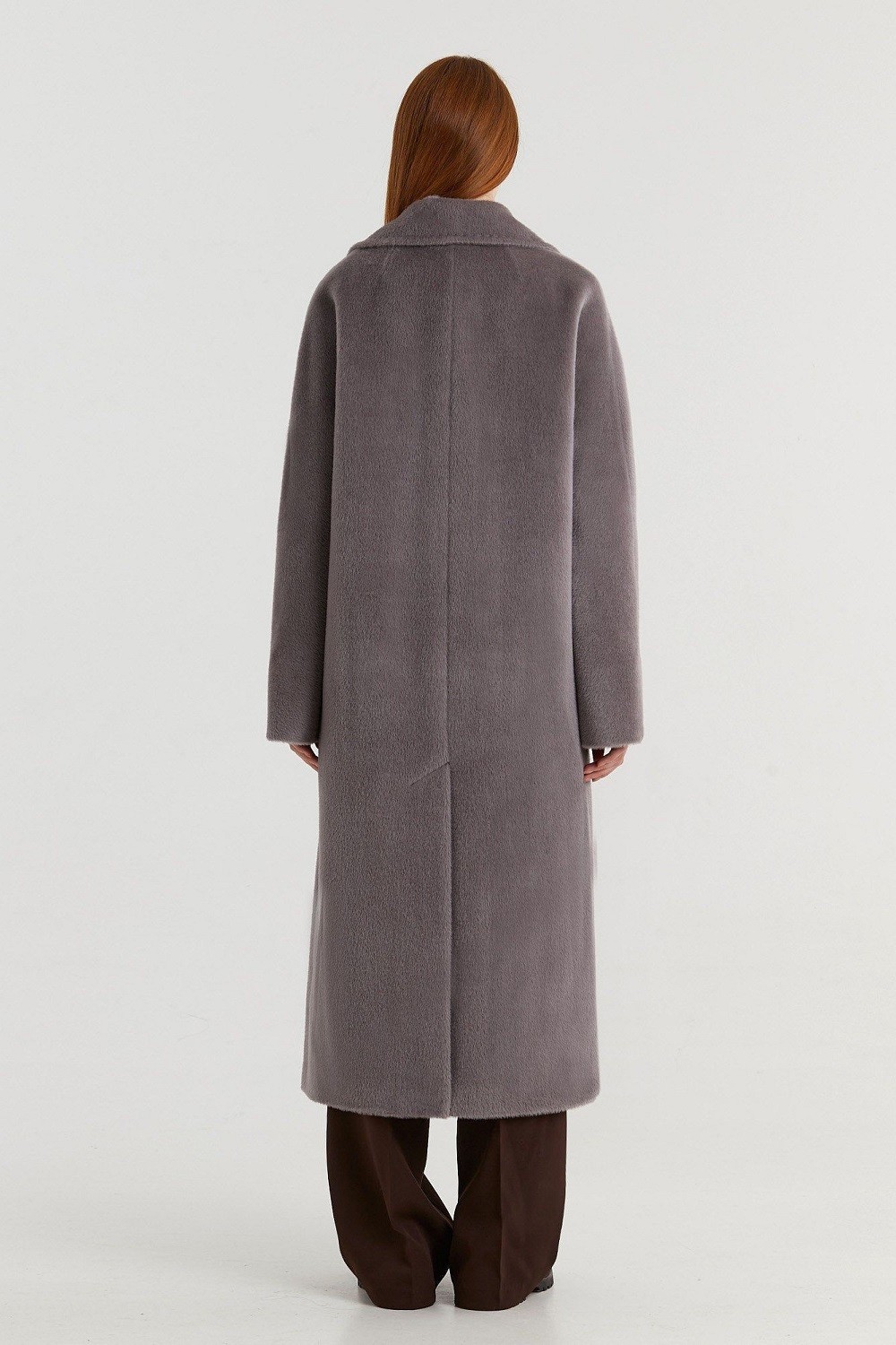 Двубортное пальто прямого силуэта с английским воротником представлено в нескольких глубоких оттенках. Цельнокроеный рукав, прорезные карманы с ласточкой, высокая шлица сзади. Пояс в тон. Подкладка из вискозы. Пальто представлено в двух вариантах состава: шерсть альпака сури и альпака бэби сури. Длина пальто 120 см. Состав верха: Бэби сури альпака - 35%; Супер сури альпака - 35%; Натуральная шерсть - 30%. В зависимости от цвета состав ткани может варьироваться. Подкладка: Вискоза - 100%.
