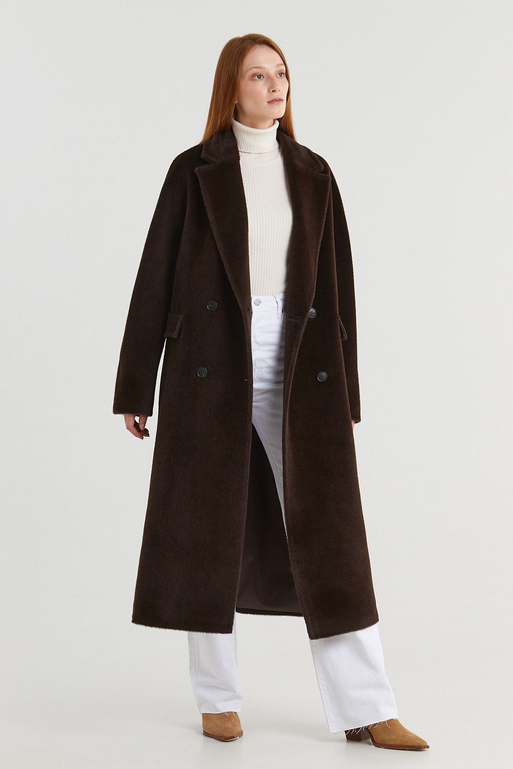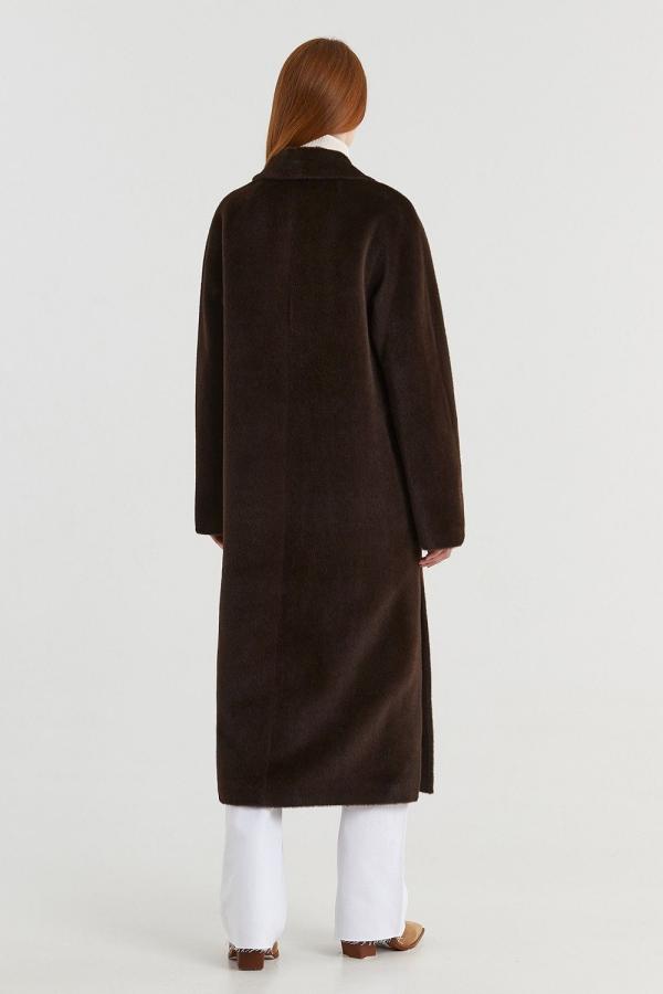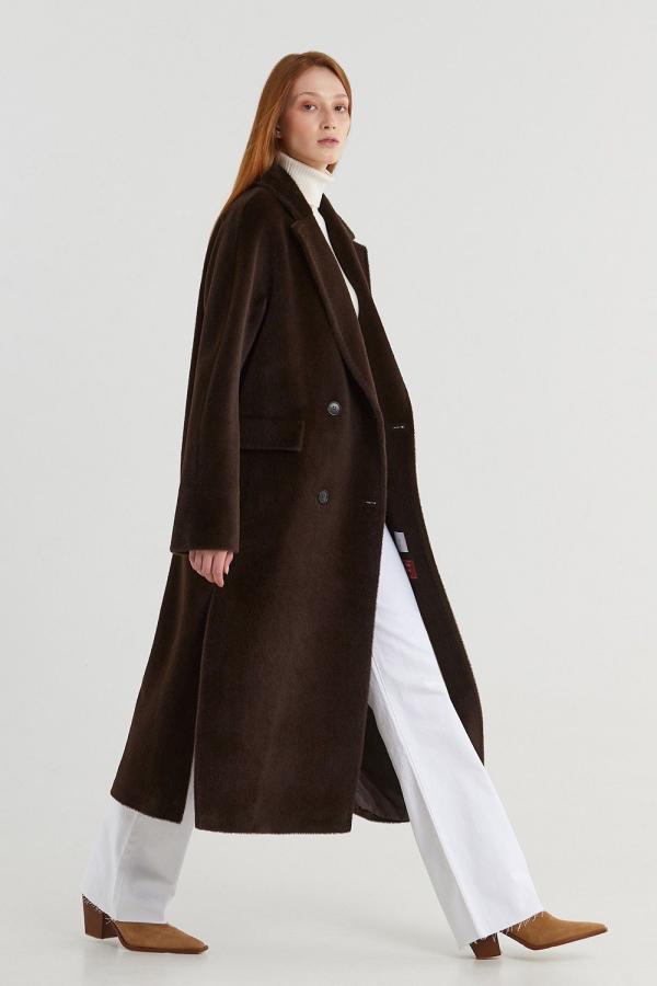 Двубортное пальто прямого силуэта с английским воротником представлено в нескольких благородных оттенках. Цельнокроеный рукав, застежка на роговые пуговицы, карманы в шве с декоративным клапаном — классические элементы данной модели. Высокие разрезы в боковых швах. Пояс в тон. Подкладка из вискозы. Длина пальто 119,5 см. Состав верха: Сури альпака - 75%, Натуральная шерсть - 25%. В зависимости от цвета состав ткани может варьироваться. Подкладка: Вискоза - 100%.