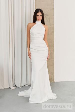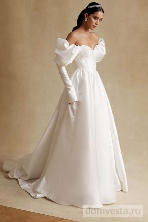 Прямое свадебное платье из кружева украшено поясом контрастного цвета с пышным цветком ручной работы.