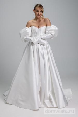 Торжество неподражаемого стиля - обворожительное свадебное платье в классическом A-силуэтном крое. Открытый лиф делает акцент на хрупких плечах и ключицах, создавая пленительный женственный образ. Ярким элементом дизайна давно модели являются объемные рукава-буфы. Длинная юбка в пол завершается роскошным шлейфом. Глубокий вырез, обнажающий ноги, усиливает драматическое настроение и позволяет добиться максимум эффектности. Финальным штрихом образа могут стать массивные украшения н шею и обворожительный блеск в глазах. Обращаем ваше внимание, что за модели данного бренда, начиная с 50 российского размера  до 54, осуществляется наценка +20%.