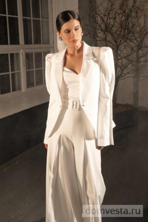 Этот костюм сочетает элегантность и современный стиль. Он состоит из белого приталенного пиджака с утонченными лацканами и застежкой на одну пуговицу, что придает ему строгий, но одновременно изысканный вид. Пиджак идеально дополнен корсетным лифом и брюками с высокой талией и прямыми штанинами, что создаёт эффект длины и визуально стройнит фигуру. Завершает образ белый ремень с крупной пряжкой, подчеркивающий линию талии. Усилить образ помогут стильные белые открытые туфли, что идеально дополнит минималистичный, но выразительный стиль костюма. Составляющие костюма можно приобрести по отдельности: жакет - 15 000 рублей, топ - 7 300 рублей, брюки+пояс+топ вместе стоят 16 400 рублей, брюки+пояс - 11 000 рублей. Обращаем ваше внимание, что за модели данного бренда, начиная с 50 российского размера, осуществляется наценка +20%, а от 54 размера +30%.