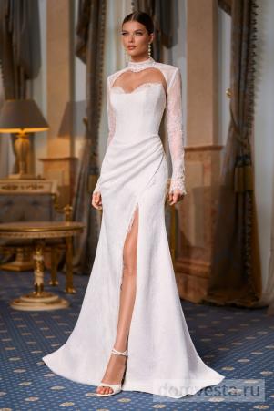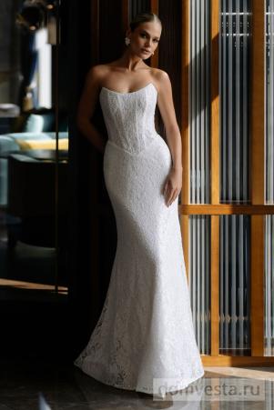 Это свадебное платье сочетает в себе элементы утонченной классики и современного стиля. Корсет с сердцевидным вырезом в зоне декольте, выполненный из кружевной ткани, обвивает талию, подчеркивая ее силуэт. Текстура кружева создает изысканный и воздушный эффект, придавая платью легкость. Изящный шлейф плавно ниспадает от бедра, в то время как юбка приталена и свободно расширяется к низу, создавая элегантный и стильный силуэт. Платье завершает утонченный шов на спине и минималистичный дизайн, который идеально сочетает в себе романтизм и современность. Обращаем ваше внимание, что за модели данного бренда, начиная с 50 российского размера, осуществляется наценка +15%, а от 54 размера +25%.