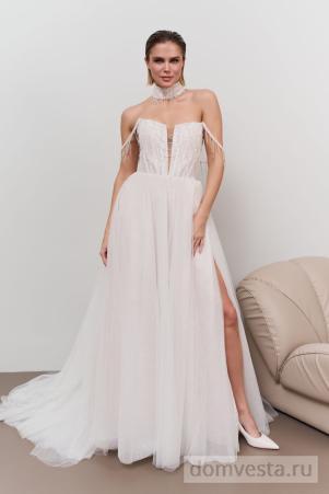Это потрясающее свадебное платье, выполненное в утонченном и элегантном стиле. Верх модели украшен красивыми складками из драпированного материала, которые плавно переходят в воздушные рукава, придающие образу невесты ощущение легкости и романтичности. Глубокое декольте красиво подчеркивает линию плеч и декольте, добавляя соблазнительности, но не теряя утонченности. Открытая спинка дополнена шнуровкой, которая не только фиксирует платье, но и подчеркивает изящную линию спины. Длинная юбка в пол с выразительным шлейфом добавляет еще больше шарма, а вырез по ноге завершает образ, придавая ему динамичность и изысканность. Обращаем ваше внимание, что за модели данного бренда, начиная с 50 российского размера, осуществляется наценка +15%, а от 54 размера +25%.