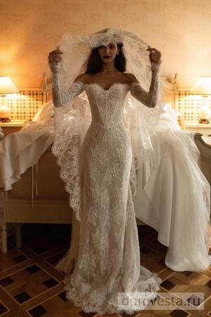 Это свадебное платье сочетает в себе утонченную классику и современный стиль. Лиф с корсетным дизайном, выполненный из гладкой ткани, идеально подчеркивает талию и создает эффектный контур фигуры. Роскошные рукава, ниспадающие по плечам, добавляют платью нотки драматизма и романтики, привнося в образ невесты элегантную мягкость. Юбка в пол плавно облегает бедра, раскрываясь к низу и создавая восхитительный силуэт "рыбка". Длинный шлейф придает платью динамичность и великолепие. Это платье идеально подойдет для невест, стремящихся создать утонченный, но в то же время сильный образ для своего свадебного дня. Обращаем ваше внимание, что за модели данного бренда, начиная с 48 российского размера, осуществляется наценка +10%, а от 52 размера +20%.