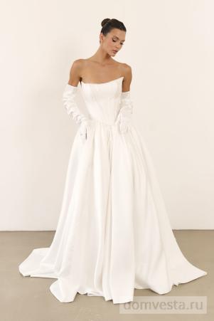 Притягательное свадебное платье с минималистичным дизайном, выполненные в прямом крое. Модель полностью покрыта сверкающим напылением, позволяя невесте буквально блистать на свадебном торжестве. Открытый лиф выгодно подчеркивает плечи и ключицы, открытая спина придает образу невесты драматичный загадочный оттенок, длинная юбка в пол завершается роскошным шлейфом. Пикантный вырез по ноге позволяет невесте произвести максимальный эффект своей фигурой. Дополнить стиль можно при помощи длинных перчаток, придающих эпичное кинематографичное настроение. Стоимость перчаток 7800 рублей, так же модель может быть в комплектации с буфами, стоимость которых 14300 рублей. Обращаем ваше внимание, что за модели данного бренда, начиная с 48 российского размера, осуществляется наценка +10%, а от 52 размера +20%.