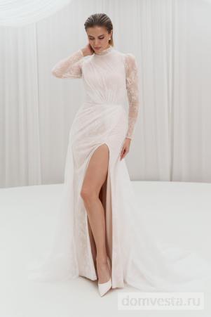 Основу образа составляет дерзкое мини-платье, выполненное из роскошного кружева с объемной вышивкой. Высокий воротник-стойка и длинные рукава придают платью изысканность и сдержанность, в то время как облегающий крой подчеркивает стройность фигуры. На плече расположен декоративный элемент, выполненный из легких, объемных цветов. Этот акцент добавляет нотку игривости и романтики, делая платье по-настоящему уникальным. Для создания более торжественного и классического образа к короткому платью прилагается длинная атласная юбка с высоким разрезом. Юбка, выполненная из гладкого, струящегося атласа, создает контраст с кружевным мини-платьем, добавляя образу величия и драматизма. На сайте указана стоимость комплекта платья и юбки, стоимость платья отдельно составляет 50 200 рублей. Обращаем ваше внимание, что за модели данного бренда, начиная с 50 российского размера, осуществляется наценка +20%, а от 54 размера +30%.