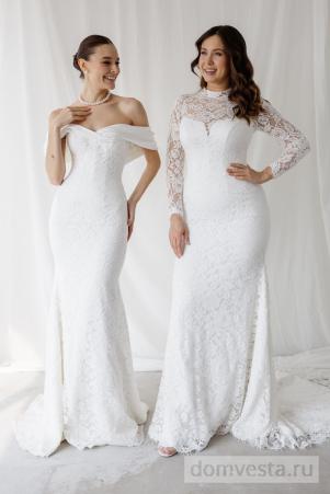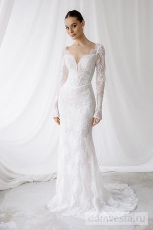 Эффектное свадебное платье силуэта рыбка на бретелях. Модель выполнена из нежной фатиновой ткани и полностью покрыта роскошным кружевным декором. Зону декольте украшает глубокий V-образный вырез, а отрытая спина, дополненная шнуровкой, добавляет шарма и грации. Лиф имеет два дополнительных выреза с прозрачными вставкам по бокам. Длинная эффектная юбка, расклешенная книзу, заканчивается роскошным шлейфом. Обращаем ваше внимание, что за модели данного бренда, начиная с 44 европейского размера, осуществляется наценка +10%.